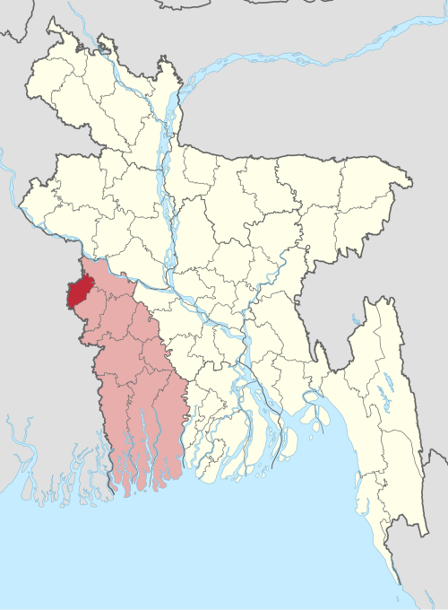 Meherpur District is a northwestern district of Khulna Division in southwestern Bangladesh. It is bordered by West Bengal, India in the west, and by the Bangladeshi districts of Kushtia and Chuadanga to the east. Pre-independence Meherpur was a subdivision of Nadia district.The district has an area of 716.08 square kilometres (276.48 sq mi). The district is situated between 23.44 / 23.59 / latitude and 88.34 / 88.53 east longitude. It is the border district of western part of Bangladesh. Daulatpur Thana of Kushtia district is West Bengal (India); southwest of Chuadanga district; Damurhuda Thana is in West Bengal (India); Mirpur in Kushtia district, Alamdanga in Chuadanga district; West Bengal of India; West Bengal, on the west, has about 60 km Indian border crossing north-south across the western part of Meherpur. Size and structure are 716.08 sq km. It consists of 03 upazilas, 03 thanas, 2 municipalities (1 class, 1 st class), 18 union, 199 mouzas and 255 villages. Name of Upazilas - Meherpur Sadar, Mujibnagar and Gangni Upazila. Population population 6,55,392 (according to 2011 census), the number of men and women is 3,24,634 and 3,30,758, the number of total number of 1,66,300. Muslim 97.76%, Hindu 1.20%, Christian 1.01%, Buddhists 0.001% Others 0.019%. Annual population growth rate is 1.02% (according to 2011 census). The population density of this district is 821 kilometers per square kilometer.